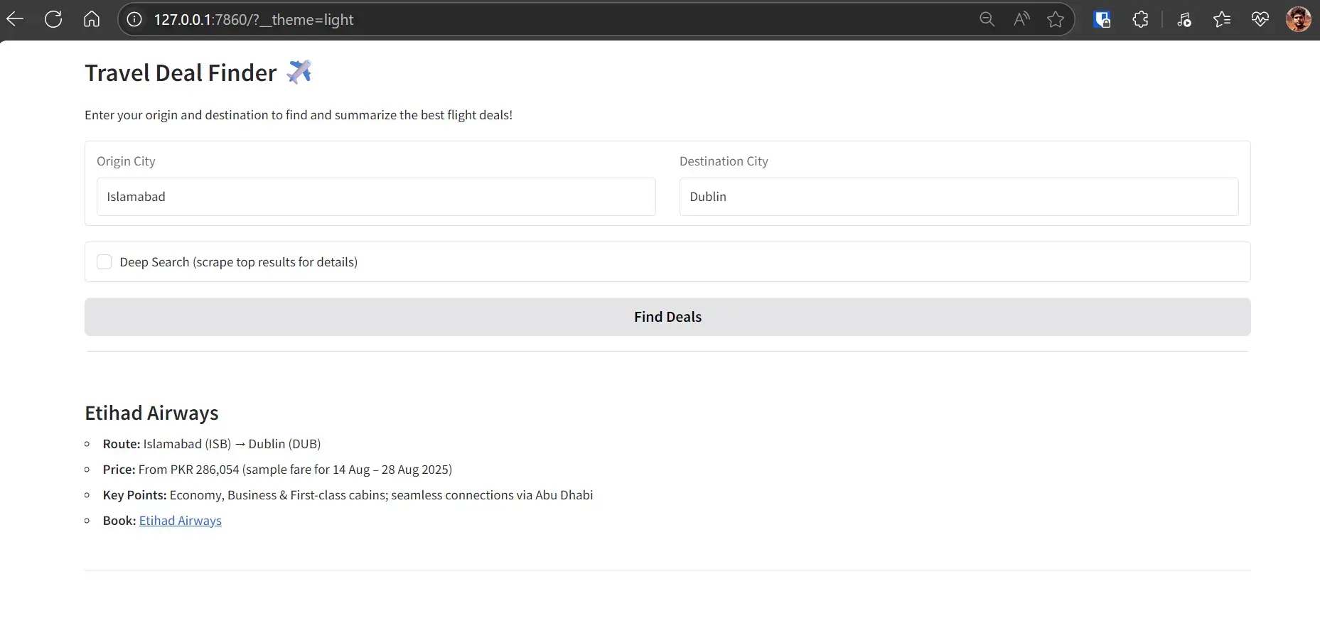 - Builds a Gradio web UI with origin/destination inputs and a “Deep Search” toggle, runnable locally
