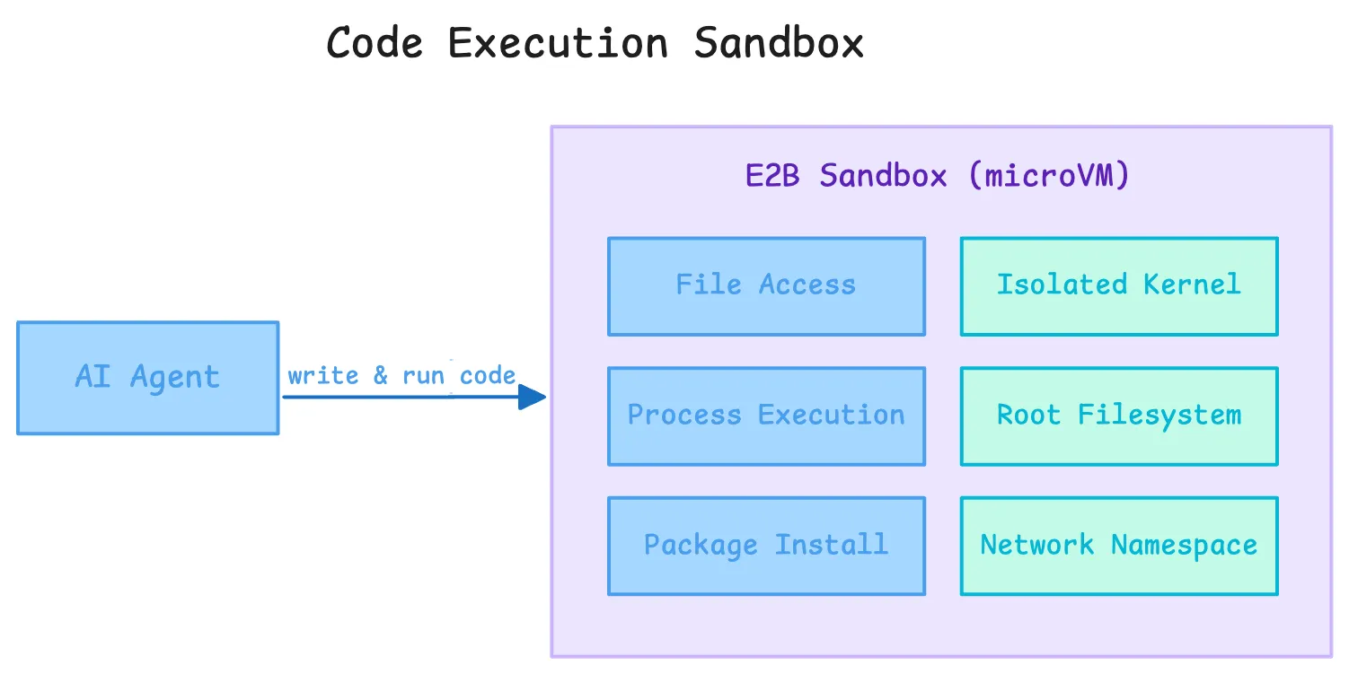E2B takes the same approach for code execution, using Firecracker microVMs (the same technology AWS uses for Lambda). Each sandbox gets its own kernel and network namespace, so a guest kernel vulnerability cannot reach the host.