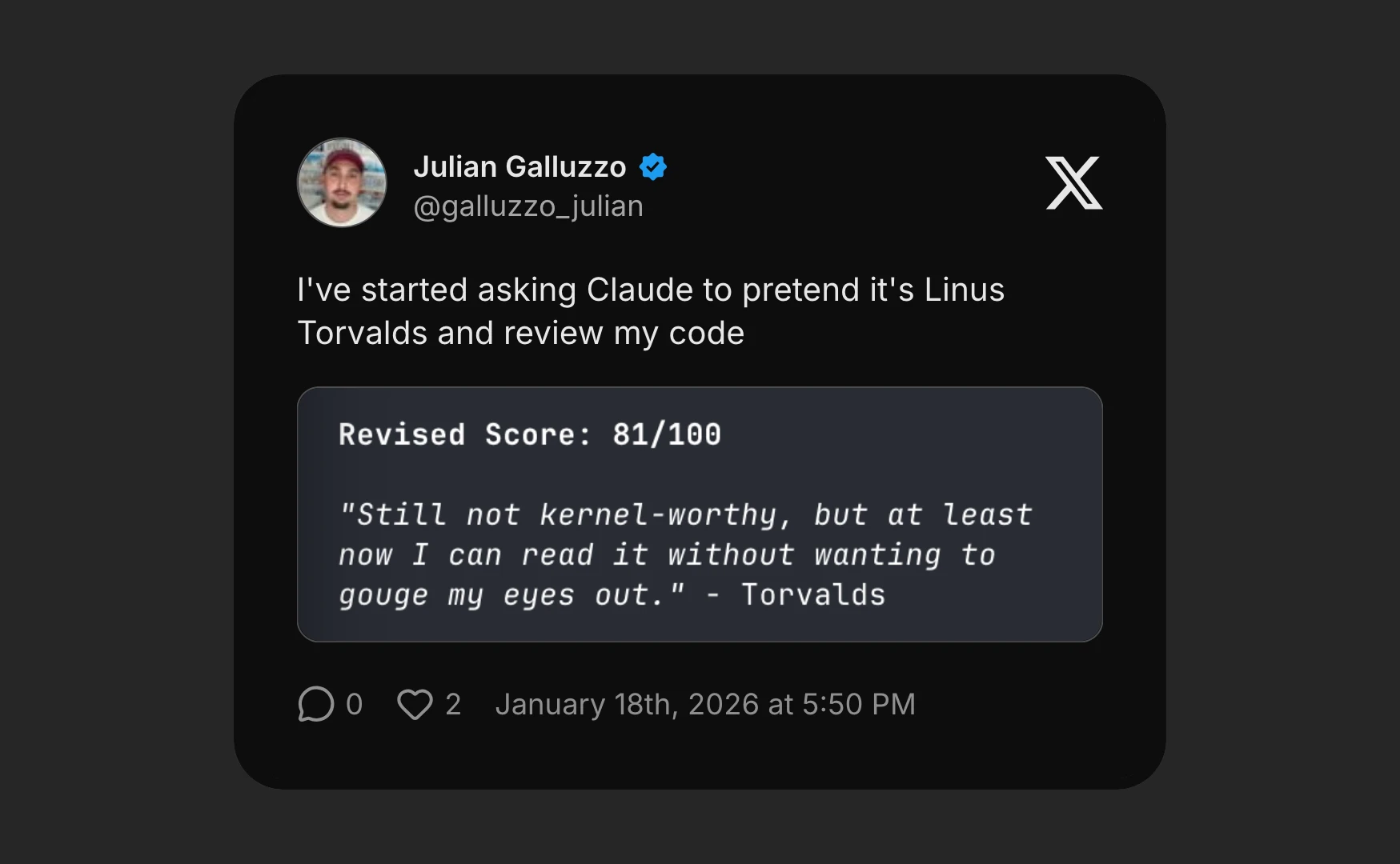 If you don't want to use the plugin directly, you can always ask Calude Code to review like Linus Torvalds.