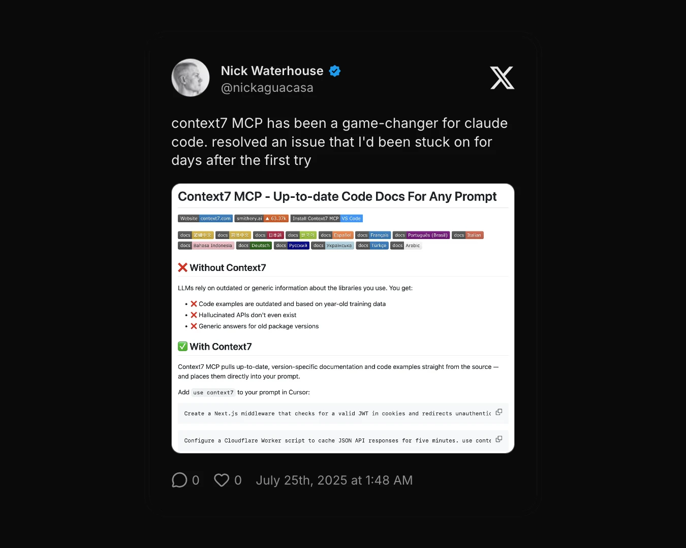 "Show me Server Actions in Next.js 15"Pros: Genuinely useful for libraries where Claude's knowledge falls behind. Pulls current docs and real examples for newer, fast-moving, or niche SDKs instead of outdated guesses. Plugs cleanly into Claude Code via MCP and works well combined with other MCP servers to improve context quality during serious coding sessions.