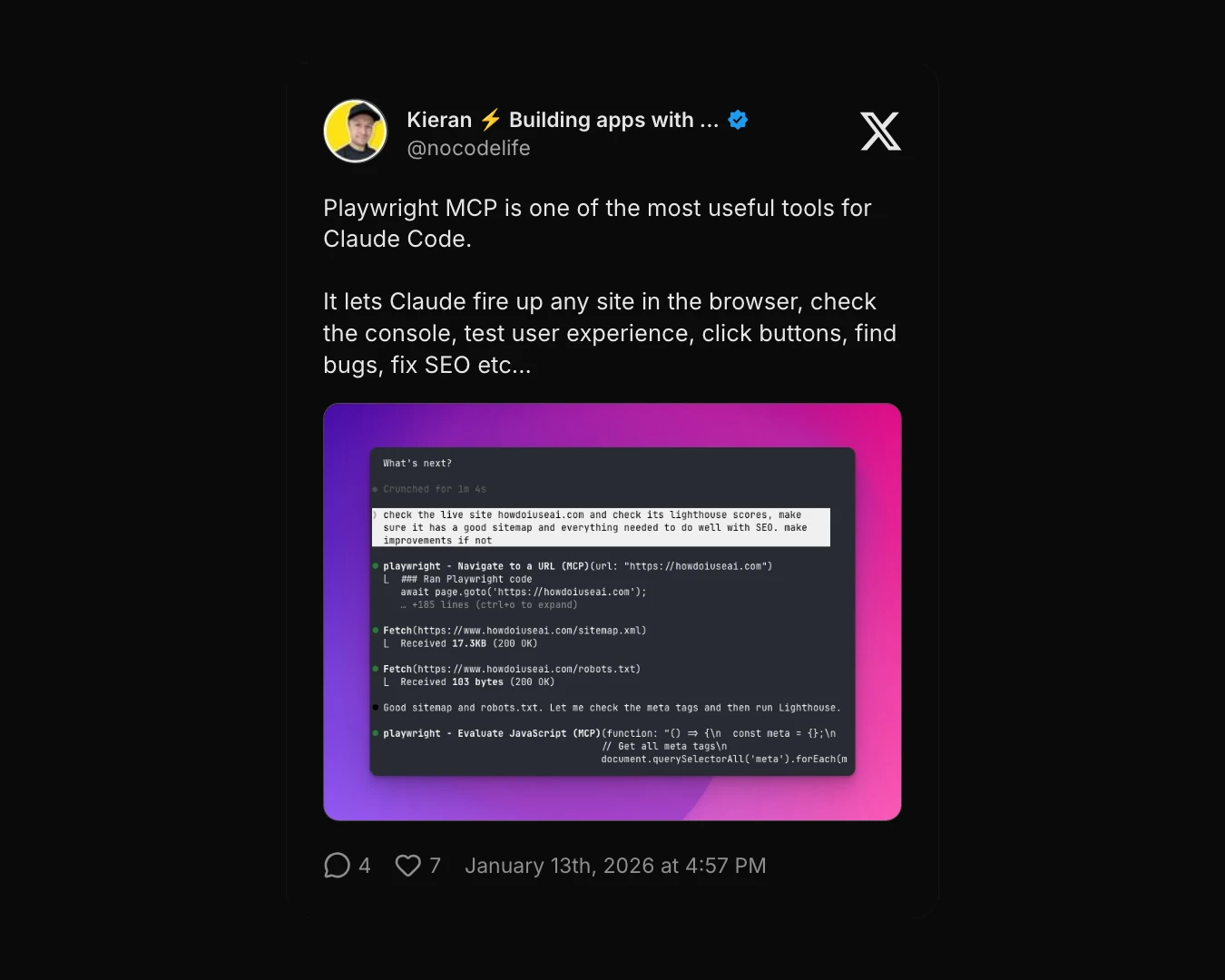 When working on my frontend projects, I use Playwright MCP to test my web apps through natural language instead of writing test scripts. I just tell Claude things like "test the checkout flow" or "fill out the contact form and submit it," and it happens.