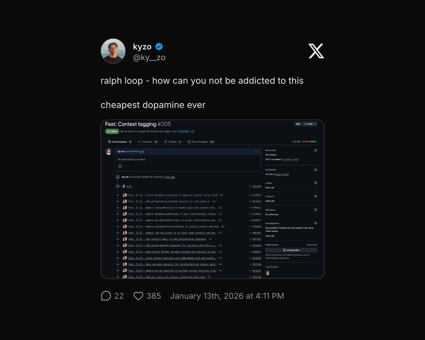 Cons: Requires setup with PRD files - not as simple as chatting. Only works when I have crystal-clear specs; vague ideas just thrash. Creates lots of small commits that need cleanup. Still burns tokens and requires me to review everything. Takes practice to write good PRDs and know when to loop versus when to intervene manually.