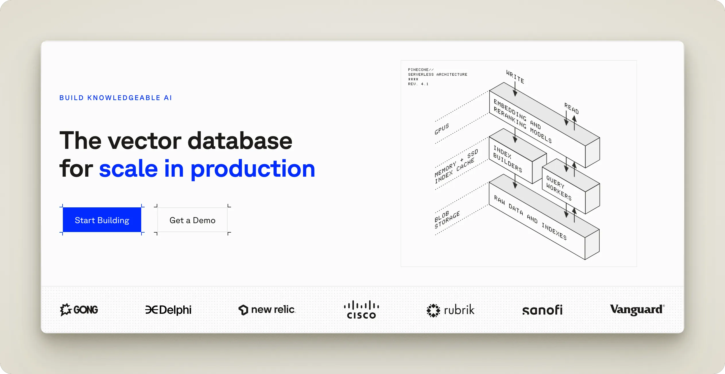 Pinecone is a vector database built for production-scale AI applications with efficient retrieval capabilities. The platform is widely used for enterprise RAG implementations, with a serverless architecture that scales automatically based on demand. Pinecone's cascading retrieval system combines dense and sparse vector search with reranking, improving search performance by up to 48% compared to standard approaches.