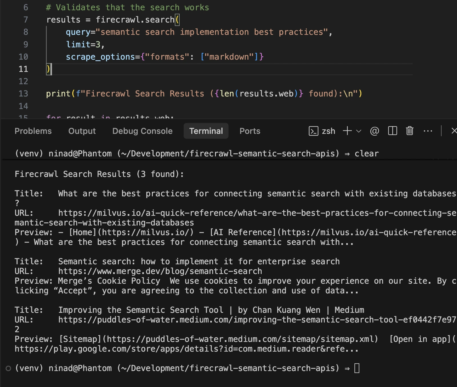 The free tier includes enough credits to validate your use case before scaling. Here's a complete example showing Firecrawl's search endpoint with content extraction: