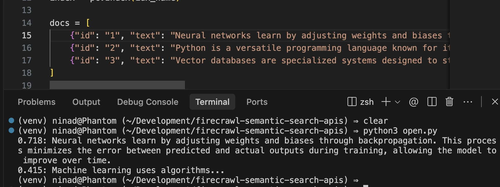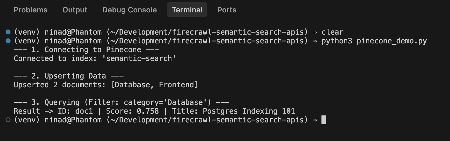 print(f"Result -> ID: {m.id} | Score: {m.score:.3f} | Title: {m.metadata['title']}")Run the above code snippet, and you’ll see a few entries in your Pinecone database. The code also queries the database for the “Database” category and Pinecone sends back the relevant result.