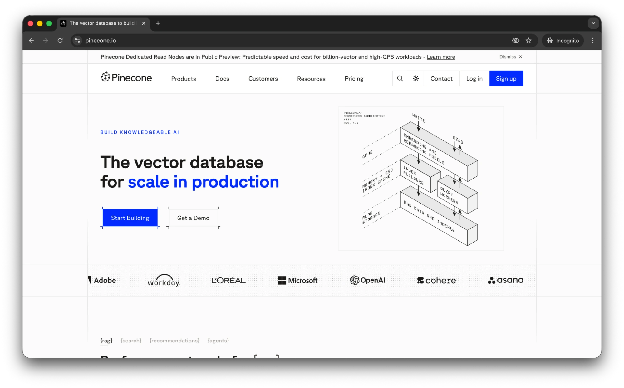 Pinecone is for the team that never wants to think about database sharding or index maintenance. Pricing is usage-based (Read/Write units), with a $50/month minimum for standard production plans.
