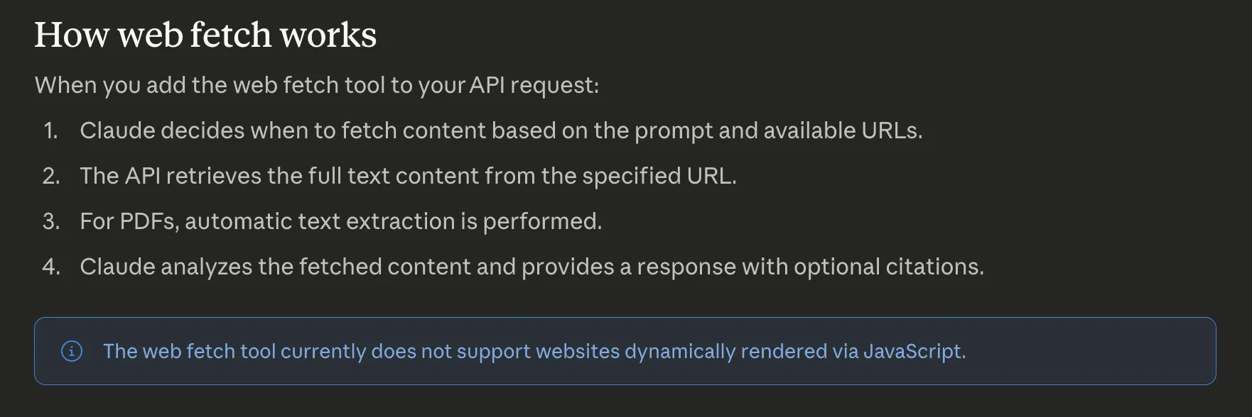This is what Anthropic's official documentation says about the Claude web fetch tool's limitations:
