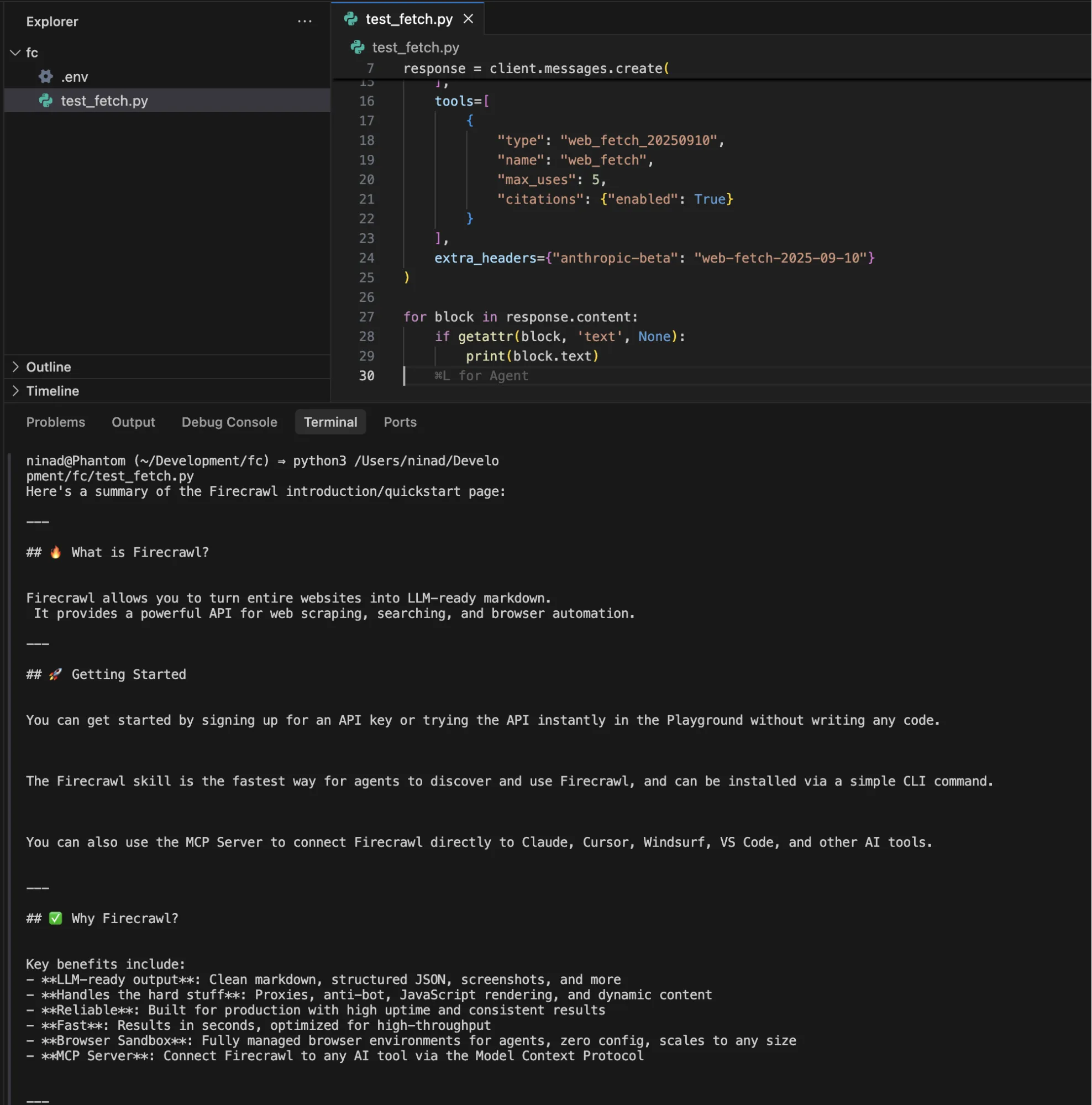 print(block.text)You can see Claude fetches the full page content as markdown and provides you with a response.