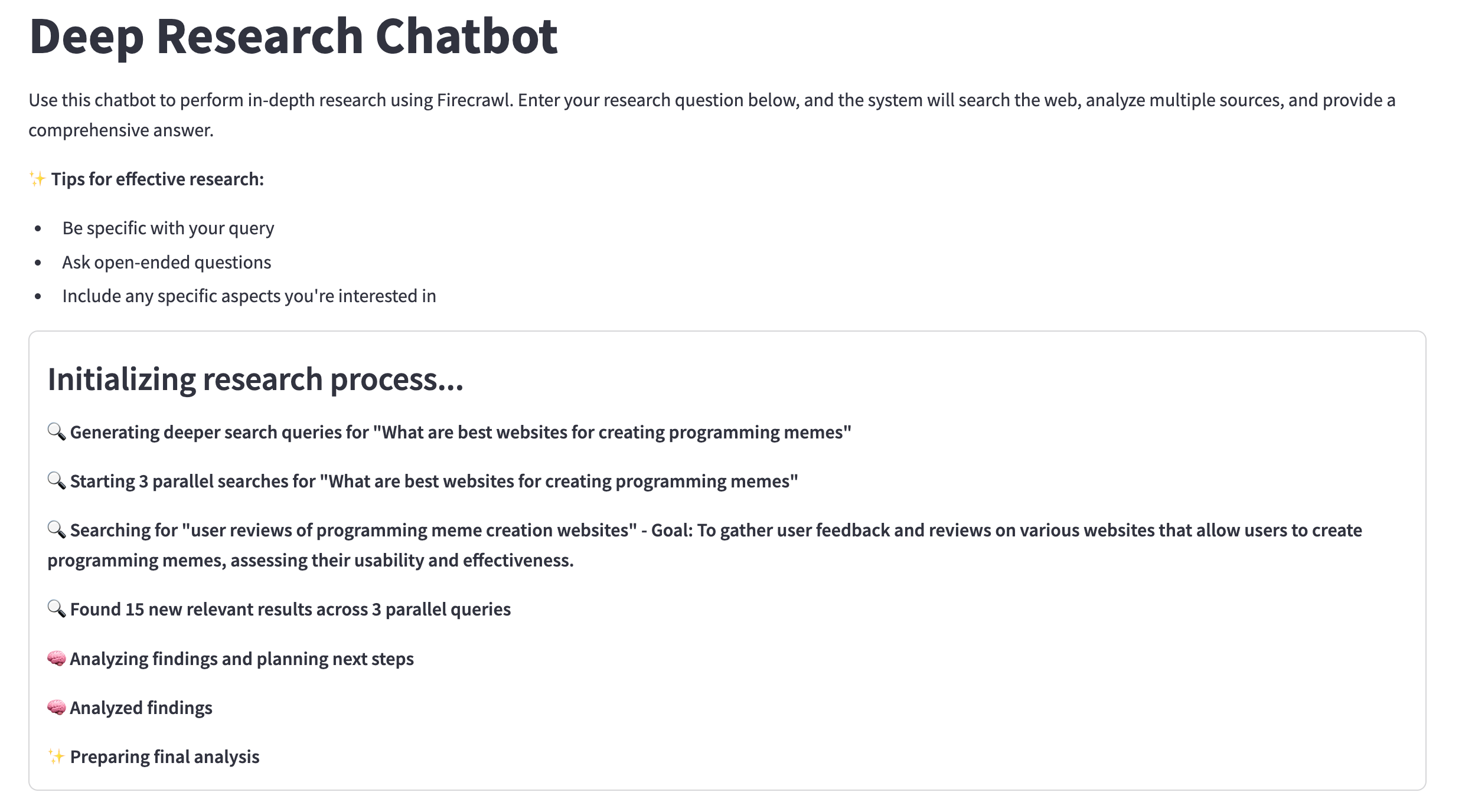 In this article, we've built a complete deep research application that transforms how users gather and synthesize information from the web. By leveraging Firecrawl's deep research endpoint, we've created a tool that automatically explores multiple sources, follows contextual threads, and provides comprehensive answers with proper citations. The Streamlit interface makes the research process transparent and interactive, with real-time updates keeping users informed at every step. This open-source implementation demonstrates how AI-powered research capabilities can be made accessible to everyone, providing an alternative to expensive commercial solutions.