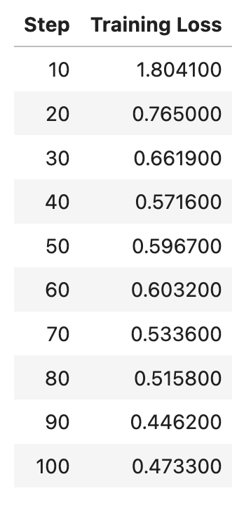 Note that for this demonstration, we are training for a fixed number of steps rather than full epochs to save time. In production, you should use num_train_epochs to train for complete passes through the dataset, along with warmup_ratio instead of warmup_steps and max_steps to scale the warmup period proportionally. This ensures proper model convergence and generalization on your full dataset.