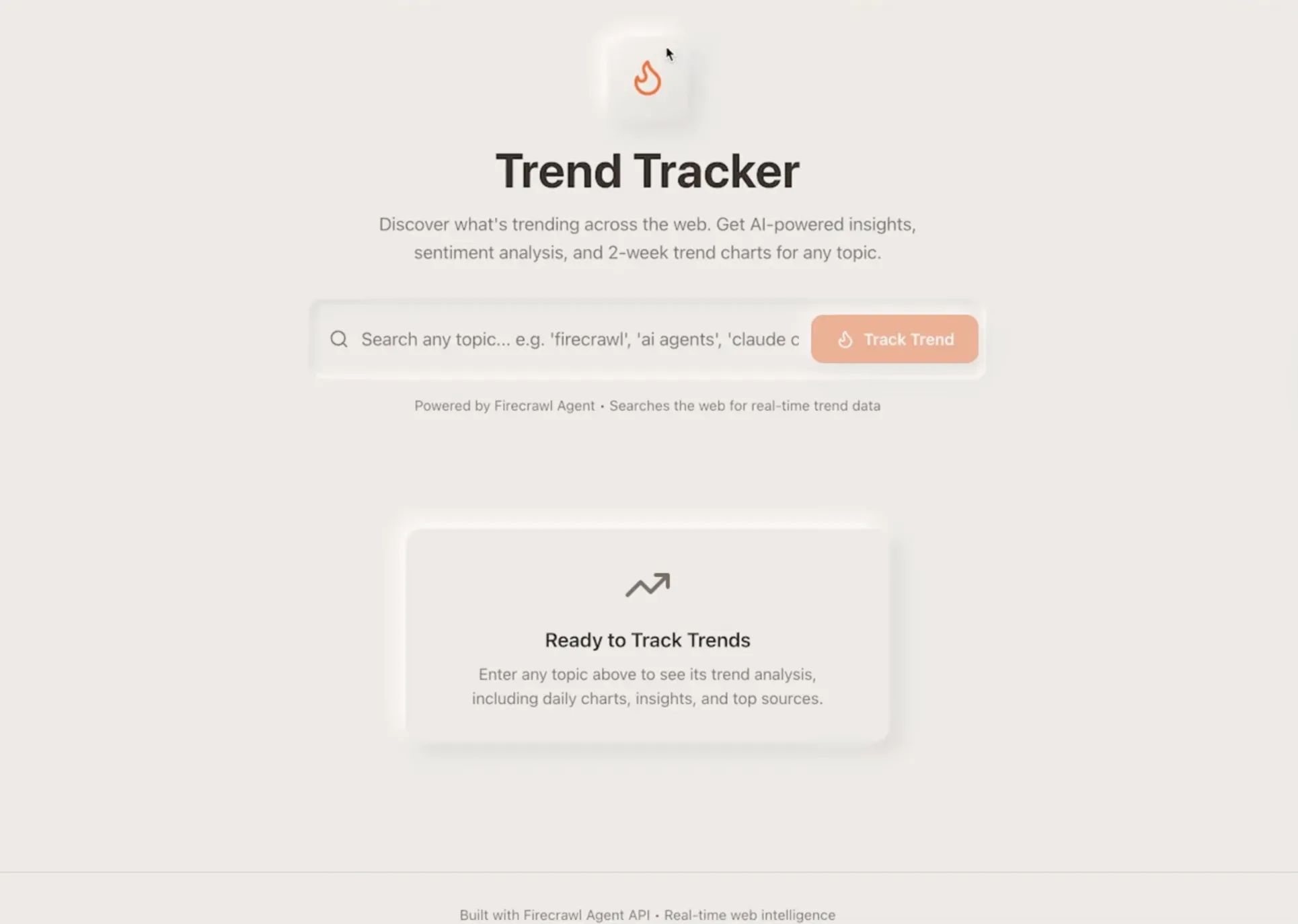 The brand analyzer uses the Scrape endpoint to pull branding, summary, and markdown in one call. The trend tracker uses the Agent endpoint to research across the web and return structured insights.