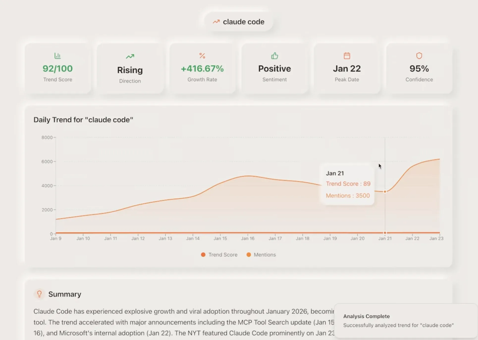 The goal: You type "Claude Code" and get back a 14-day trend analysis with insights, related topics, and sources.
