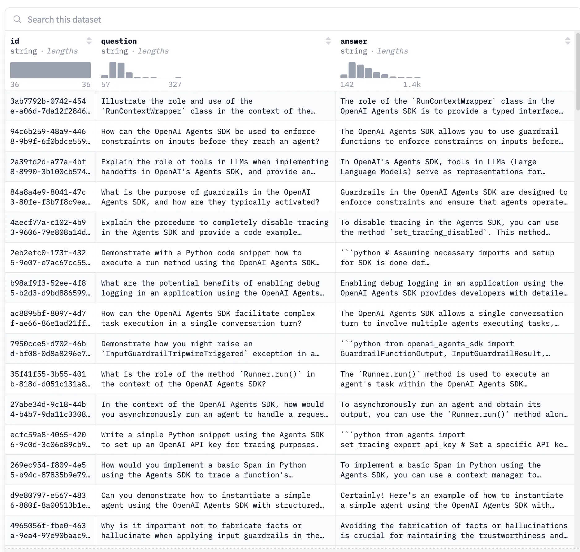 As you can see, we've already captured the Agents SDK's documentation in the form of hundreds of question-answer pairs and uploaded it as a dataset to HuggingFace Hub. Each pair will teach Gemma a key piece of information about the documentation and the framework's syntax.