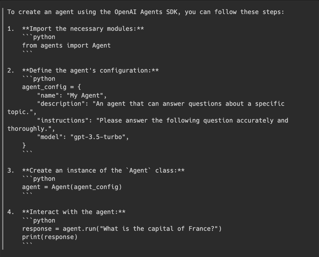 Unfortunately, the model is widely off-the-mark here. The output is not great, the model now correctly recognizes the Agents framework but the syntax is incorrect. This can be due to various factors such as low dataset quality, smaller dataset size, bad tuning parameters, and other issues we didn't spend much time optimizing. These limitations highlight the importance of high-quality training data and careful parameter selection when fine-tuning language models.