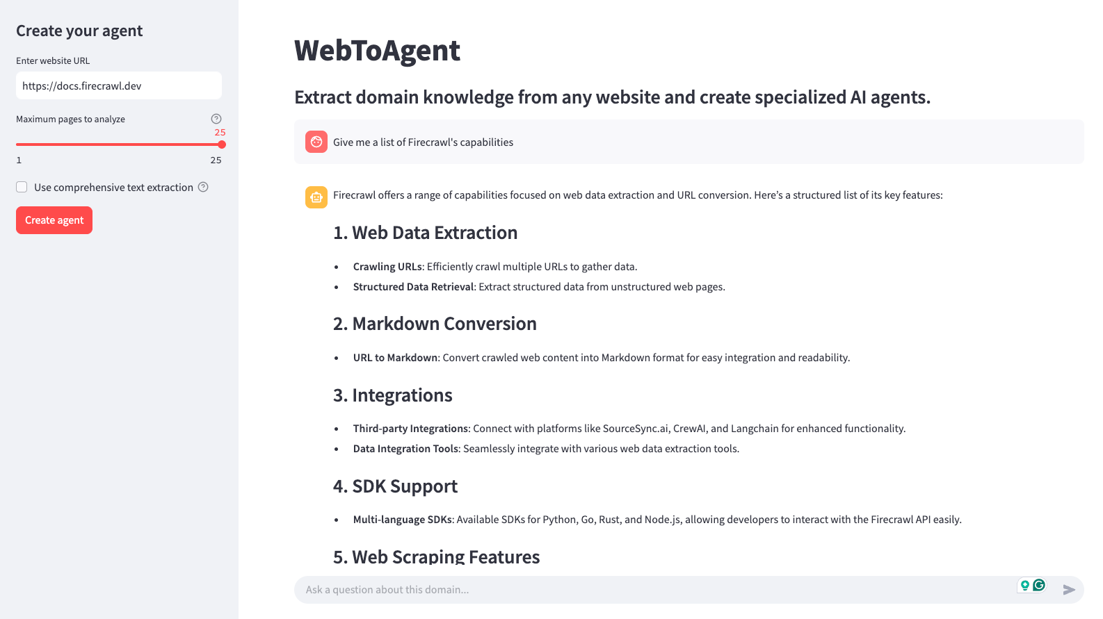 Ready to build your own website-to-agent application? Sign up for Firecrawl at https://firecrawl.dev and explore the LLMs.txt endpoint that powers this entire system. In just minutes, you can extract clean, structured content from any website without worrying about complex scraping logic or content filtering. Whether you're building a question-answering system, a domain-specific chatbot, or a comprehensive knowledge base, Firecrawl's API provides the foundation you need to transform web content into valuable, interactive experiences.